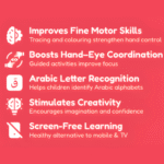 Introduces the product as an innovative, engaging, and fun way to learn the Arabic alphabet for young children. It’s an oversized coloring roll (12 x 76 inches) providing ample space for tracing, coloring, and familiarizing with letters. It transforms learning into an artistic journey, fostering a love for the Arabic language and script. It’s an ideal resource for parents and educators seeking a hands-on, interactive method.