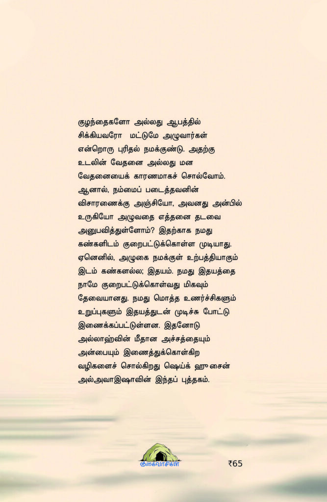 இந்த புத்தகம் நம் இதயத்தின் ஆழத்தைக் கவரும் ஒரு ஆன்மீக வழிகாட்டியாகும். நம்மில் பெரும்பாலோர் அழுகையை உடல் வேதனை அல்லது மன வலியுடன் மட்டும் இணைத்துக் கொள்கிறோம். ஆனால், அல்லாஹ்வின் அச்சத்திலும் அன்பிலும் அழுவது ஒரு விசேஷமான ஆன்மீக அனுபவம் என்பதை இந்த புத்தகம் விளக்குகிறது.
