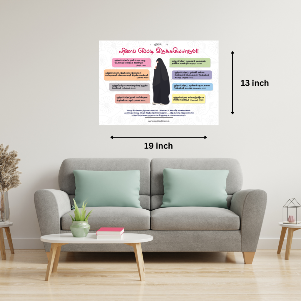 The “Conditions of Hijab Tamil Islamic Poster” is an excellent addition to any learning space, whether it be in homes, schools, Masjid, Markaz, Maktab, Madras or dawah centers. It provides an opportunity for interfaith dialogue, promoting tolerance, respect, and appreciation for the diverse spiritual traditions that have shaped human history.