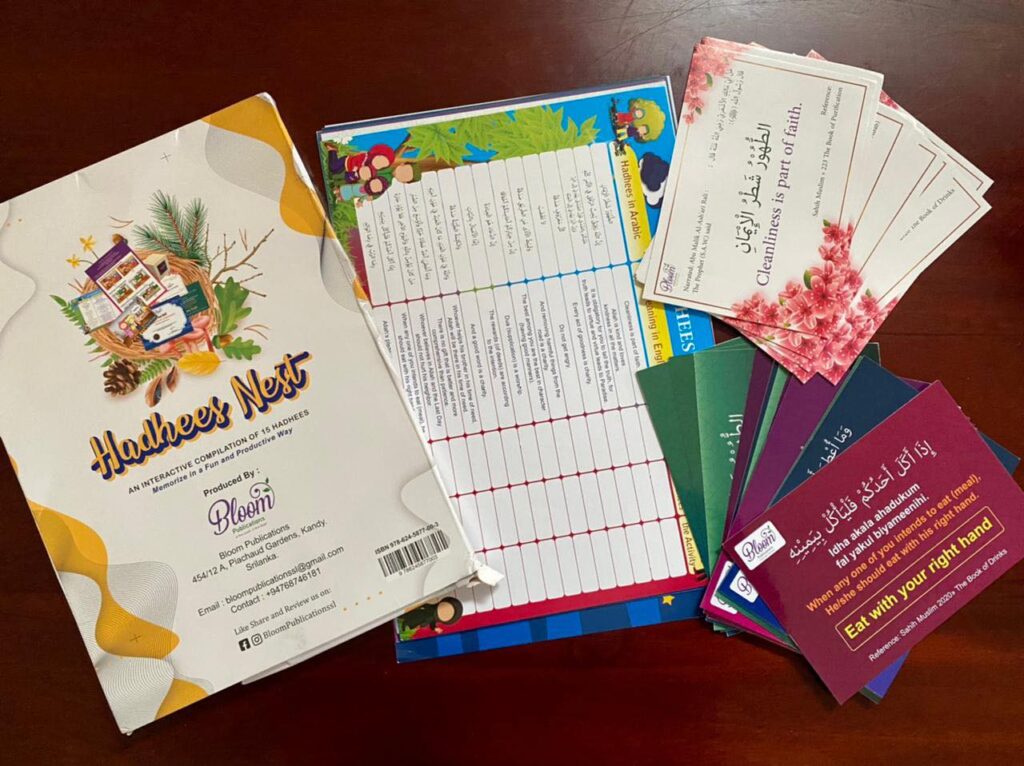 An Interactive Compilation of 15 Hadhees Memorize in a Fun and Productive Way Contents 15 Hadhees Flash Cards 15 Hadhees Stickers 15 Activity Sheets 2 Mini Activity Based Boxes 1 Hadhees Tracker 1 Certificate of Achievement