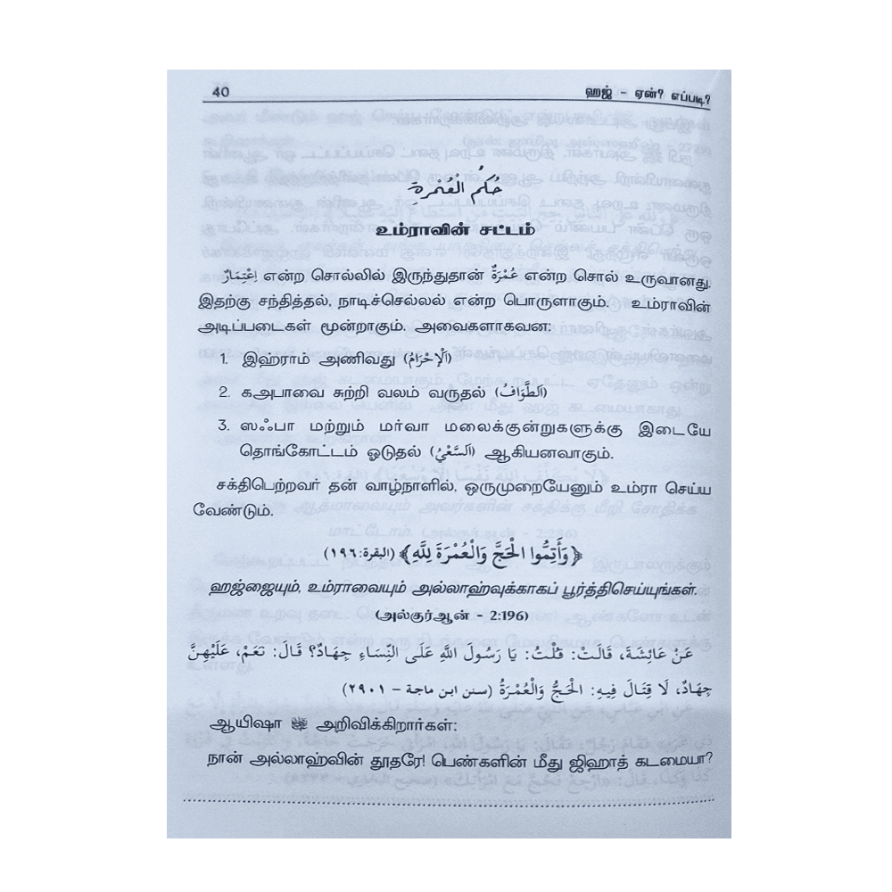 ஹஜ் ஏன்? எப்படி? நூல் ஹஜ் மற்றும் உம்ரா செய்வதற்கான முழுமையான வழிகாட்டுதலை வழங்குகிறது. தமிழ் பேசும் முஸ்லிம்களுக்கு ஹஜ் மற்றும் உம்ராவின் அர்த்தம், முக்கியத்துவம், கடமைகள், மற்றும் நடைமுறை வழிமுறைகள் ஆகியவற்றை எளிமையாகவும் தெளிவாகவும் விளக்குகிறது.