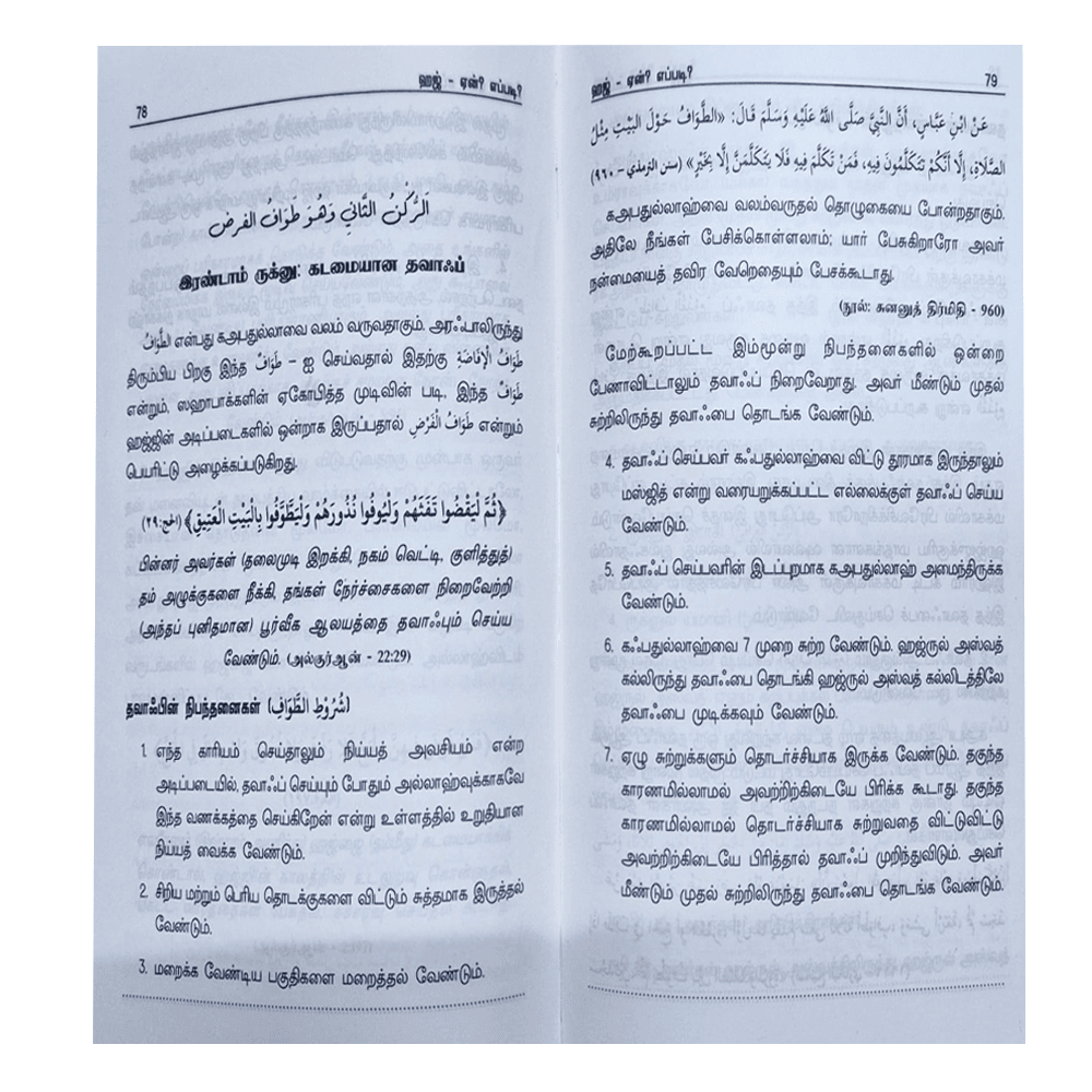 நடைமுறை வழிகாட்டுதல்: இஹ்ராம் அணிதல், தவாஃப், சஈ மற்றும் பிற சடங்குகள் எளிய முறையில் விளக்கப்படுகின்றன.