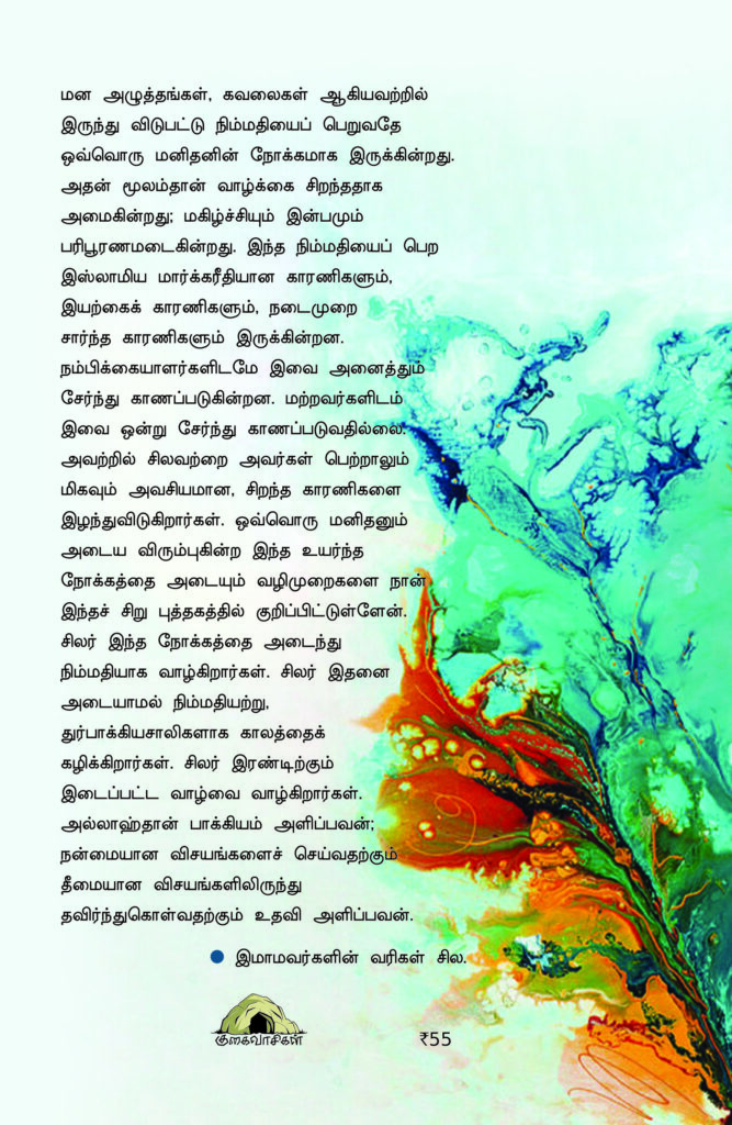 இந்த புத்தகம் ஒவ்வொரு மனிதனும் விரும்பும் நிம்மதி மற்றும் மகிழ்ச்சியை அடைய உதவும் இஸ்லாமிய மற்றும் நடைமுறை வழிகாட்டுதல்களை வழங்குகிறது. வாழ்க்கையில் ஏற்படும் மன அழுத்தங்கள், கவலைகள் மற்றும் துன்பங்களிலிருந்து விடுபட்டு அமைதியான வாழ்வு நடத்துவதற்கான முறைகளை இந்த நூல் விரிவாக எடுத்துரைக்கிறது.