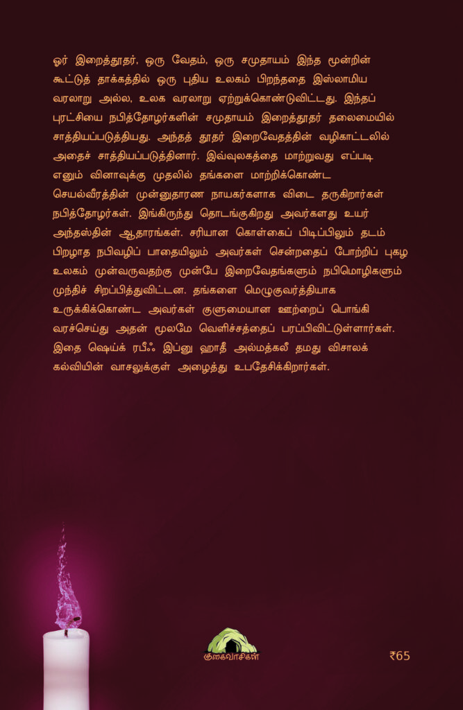 நபித்தோழர்கள் தங்களை மெழுகுவர்த்தியாக உருக்கிக்கொண்டு உலகிற்கு வெளிச்சம் தரும் ஊற்றை உருவாக்கினர். அந்த ஊற்று இன்று வரை முஸ்லிம்களின் நம்பிக்கையையும் செயல்பாட்டையும் வளர்க்கிறது. இந்த புத்தகம், நபித்தோழர்களின் உயர்ந்த நிலையைப் புரிந்துகொண்டு அவர்களைப் பின்பற்ற விரும்பும் ஒவ்வொருவருக்கும் ஒரு ஆழமான வழிகாட்டி.