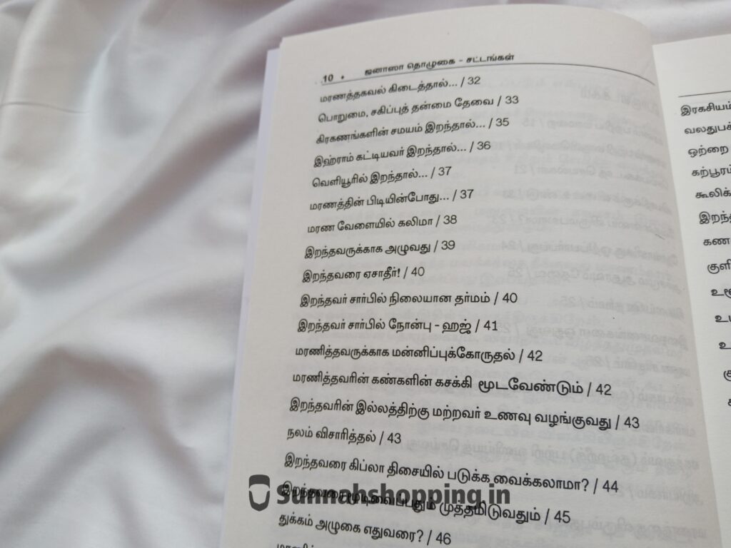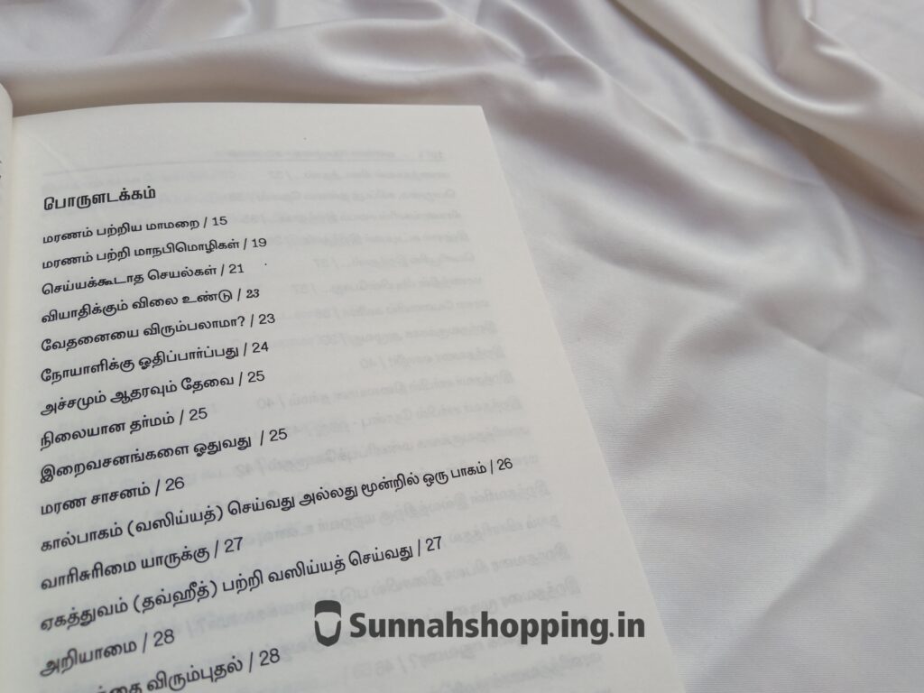 இந்த நூலில் ஜனாஸாவின் தொழுகையும், வியாதியில் வீழ்ந்தது முதல் மரணத்தில் வீழும் வரை, மரணித்தவருக்கு கபன் ஆடை கிழிப்பது முதல் அடக்கம் செய்யப்படும் வரை, கூடும் செயல்கள், கூடாத செயல்கள்யாவும் கூறப்பட்டுள்ளது. இறக்கப் போகும் எல்லா மானிடப் பிறவிகளும் இதன் சட்டங்களை அறிவது அவசியம். அதனை எளிய இனிய நடையில் விளக்கியிருக்கிறார் இந்நூலாசிரியர்.