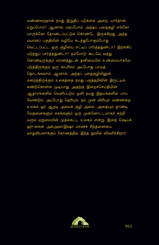 மண்ணறைதான் நமது இறுதிப் படுக்கை அறை. யார்தான் மறுப்போம்? ஆனால், மறப்போம். அந்தப் புதைகுழி எங்கோ யாருக்கோ தோண்டப்பட்டுக் கொண்டே இருக்கிறது. அந்த மயானப் பகுதியின் வழியே கடந்துபோகும்போது வெட்டப்பட்ட ஒரு குழியை எட்டிப் பார்த்ததுண்டா? இறங்கிப் படுத்துப் பார்த்ததுண்டா? நம்மோடு கூடவே வந்து கொண்டிருக்கும் மரணத்துடன் தனிமையில் உண்மையாகவே படுத்திருக்கும் ஒரு ஸ்பரிசம் அப்போது பரவத் தொடங்கலாம். ஆனால், அந்தப் புதைகுழியினுள் மறைந்திருக்கும் உலகத்தை நமது பகுத்தறிவின் இருட்டில் கண்டுகொள்ள முடியாது. அதற்கு இறைச்செய்தியின் ஆதாரங்களில் வெளிப்படும் ஒளி நமது இதயங்களில் பாய வேண்டும். அப்போது தெரியும், நம் முன் விரியும் மண்ணறை உலகம் ஓர் ஆறடி அகலக் குழி அல்ல. அதையும் தாண்டி வேதனைகளும் சுகங்களும் ஒரு முன்னோட்டமாகச் சுற்றி வரும் மறுமையின் முதல்கட்ட உலகம் என்று. இதை ஷெய்க் ஹுசைன் அல்அவாஇஷா மரணச் சிந்தனையை வாழ்வியலாக்கும் கோணத்தில் இந்த நூலில் விவரிக்கிறார்.