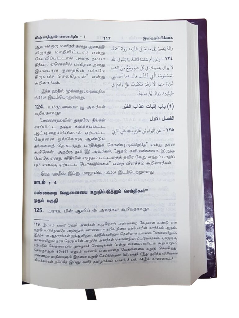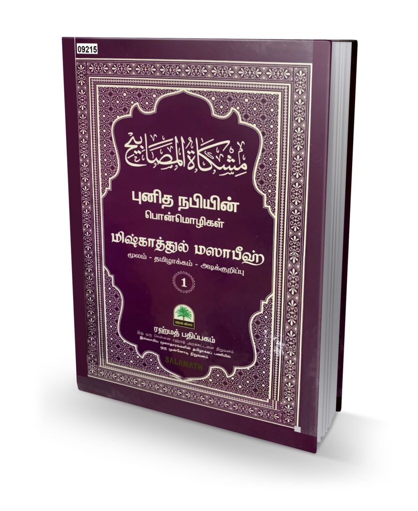 Book Mishkathul Masabeeh Part 1 Publication Rahmath Padippagam Author Imam Khatib at–Tabrizi ISBN-13 – Language Arabic – Tamil Edition 1 Binding Hard cover Number of Pages 500+ Pages மிஷ்காத்துல் மஸாபீஹ் நூல் அறிமுகம்: எல்லாப் புகழும் அல்லாஹ் ஒருவனுக்கே உரித்தாகுக. அருளும் அமைதியும் அல்லாஹ்வின் தூதர் முஹம்மத் அவர்களின் மீதும் அவர்களைப் பின்பற்றி வாழ்ந்த சத்தியத் தோழர்களின் மீதும் நம் அனைவரின் மீதும் என்றென்றும் நிலவட்டுமாக. ‘மிஷ்காத்துல் […]