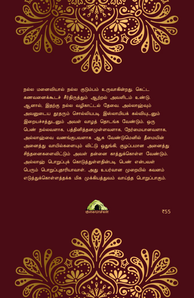 குடும்ப வாழ்வின் அடித்தளமாகிய பெண்ணின் பண்புகளை இஸ்லாமிய கோணத்தில் விளக்கும் மதிப்புமிக்க நூல். ஒரு நல்ல மனைவியின் நற்பண்புகள் இல்லாமல் ஒரு குடும்பம் நிலைத்திருக்க முடியாது என்பதைக் கூறுகிறது இந்நூல்.