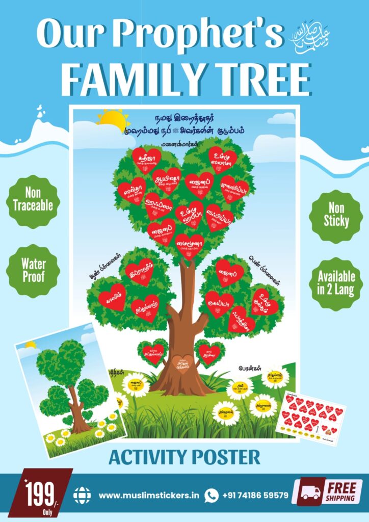 Life of Prophet Muhammad ﷺ Poster Book Name Prophet’s Family Tree Activity Author Yousuf Sunnah Category Poster Publisher Muslim Stickers Language English/Tamil Size 13 x 19 inches Binding Tick syntactic Board Number of Pages 1