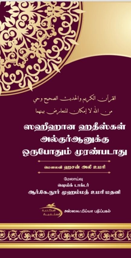 Click here Download this Book PDF: Download Book Name Saheehana Hadees Al-Quranukku Orupodum Muranpadadu Author Hasan Ali Umari Revised Dr.R.K. Noor Muhammed Madani Publisher Ashaabul Hadeeth Publication Language Tamil Edition 2nd Binding Soft Number of Pages 116 Pages நூல் அறிமுகம்: நபி (ﷺ) அவர்களுக்கு வழங்கப்பட்ட அற்புதமாகவும், அவர்களின் நபித்துவத்தை உண்மைப்படுத்துவதற்கு அடையாளமாகவும் நபி (ﷺ) அவர்கள் கூறிய பல முன்னறிவிப்புகள் […]