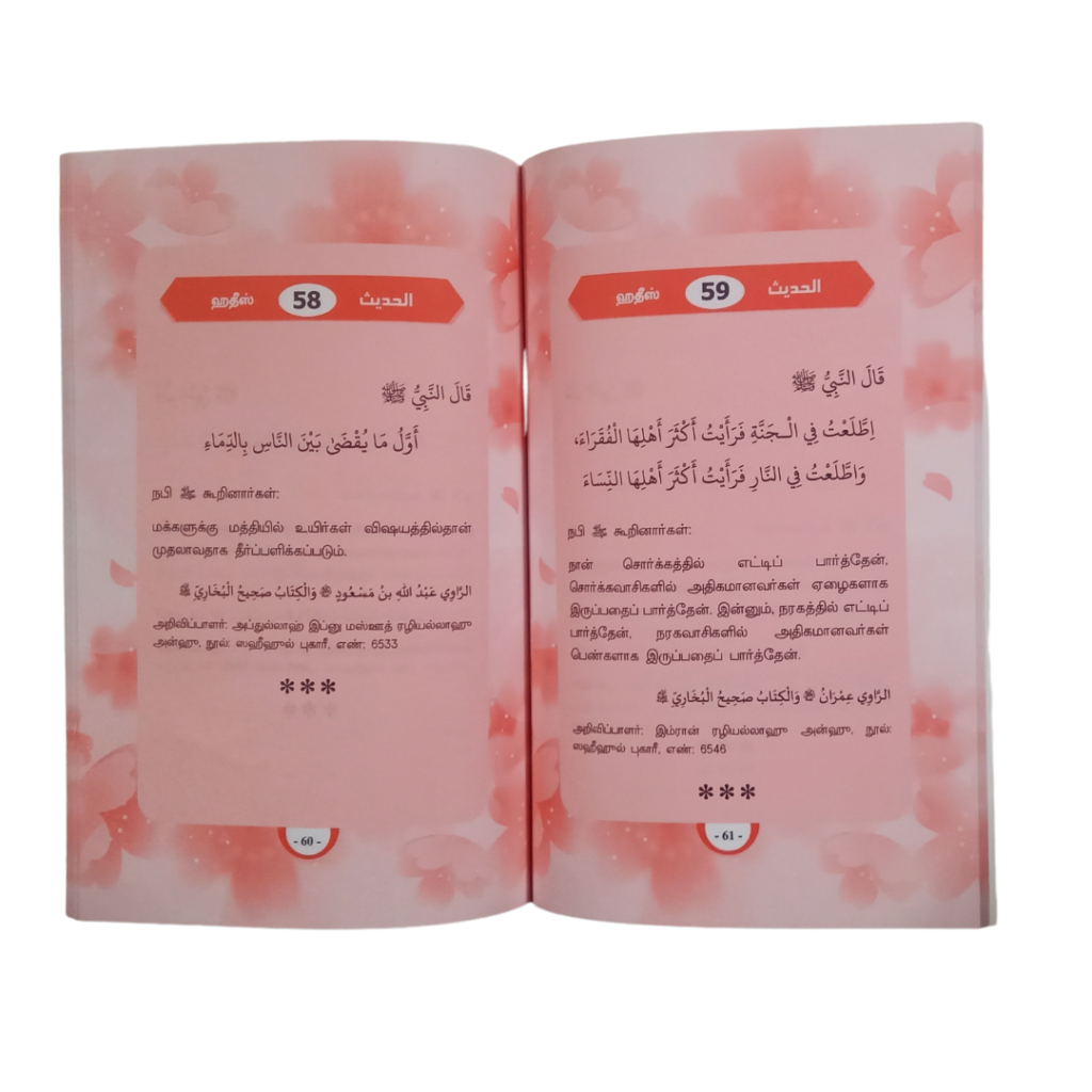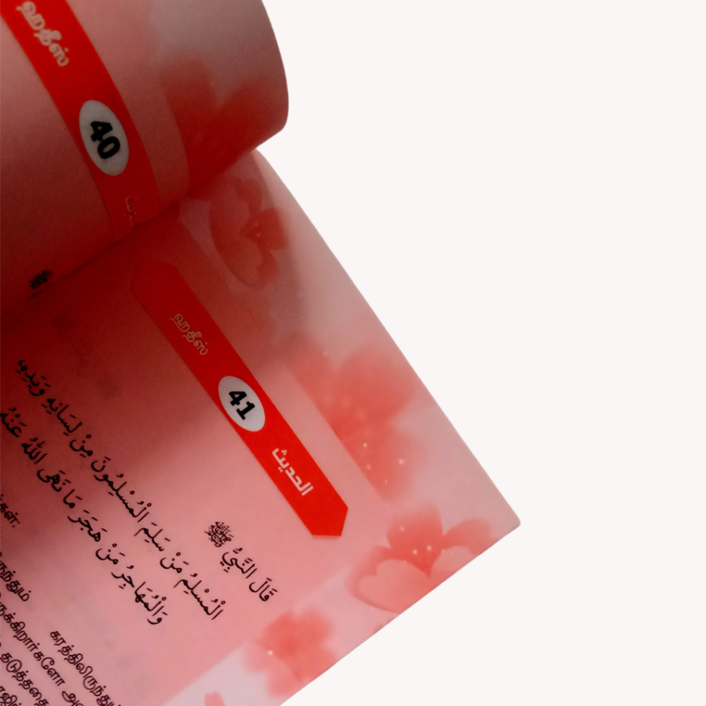 தமிழும் அரபியும் சேர்த்து தயாரிக்கப்பட்ட இந்த ஹதீஸ் புத்தகம், குழந்தைகள் மற்றும் இஸ்லாமியத் தொடக்கப் பயிலாளர்கள் எளிதாக மனனம் செய்யும் வகையில் எளிய முறையில் தொகுக்கப்பட்டுள்ளது. மக்தப்கள், மதரஸாக்கள் மற்றும் வீடுகளிலும் பிள்ளைகளுக்கு ஹதீஸ் கற்றுக் கொடுக்கும் மற்றும் மனனம் செய்ய உதவும் சிறந்த தேர்வாக இது அமைந்துள்ளது.