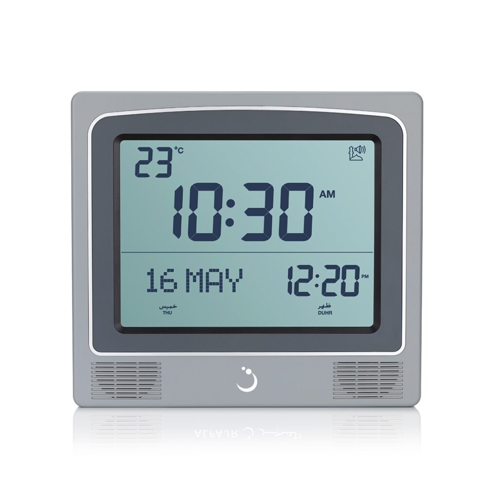 Features: Worldwide Prayer times Prayer Alarms Arabic/English Language Hijri & Gregorian Calendars Temperature Display °C/°F Display Type: Digita Dimensions: LCD: 20 cm (8 Inch) Length: 22 cm, Height: 20 cm